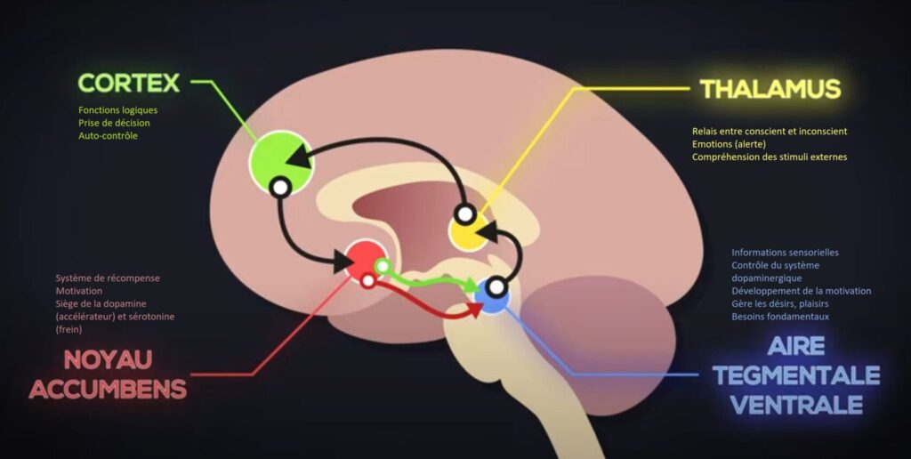 Vous remarquerez que le circuit dopaminergique (les flèches) utilise toutes les zones. Ce n’est pas pour rien ! La dopamine est un neuromédiateur impliqué dans la motivation, l’énergie, le passage à l’action dans le but de survivre, voilà pourquoi il est si difficile d’y résister, c’est avant tout un mécanisme de survie inconscient !