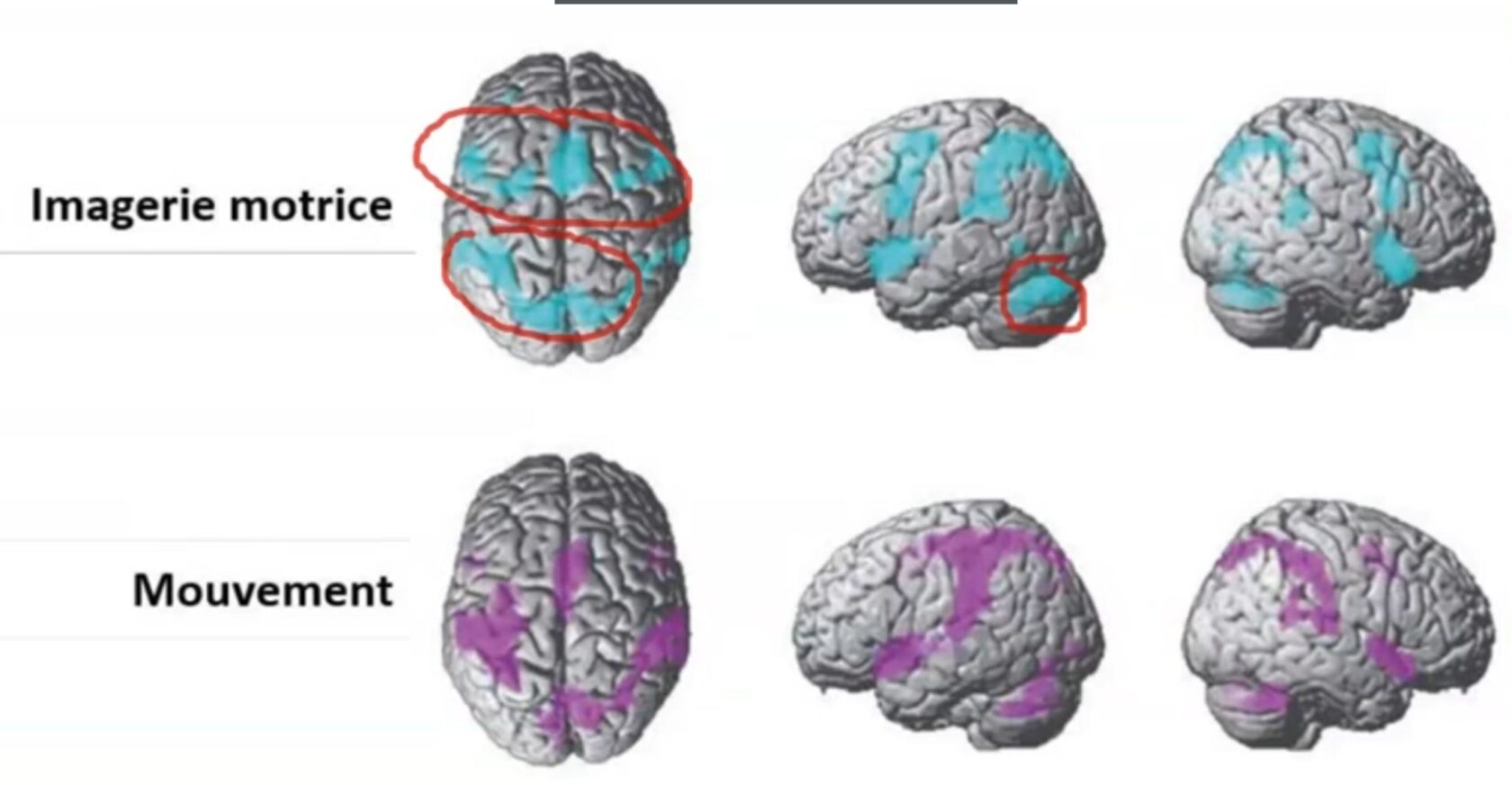 Voici un exemple provenant d’une étude scientifique d’exercice de visualisation VS un exercice effectué dans la vraie vie. Observez à l’IRM les zones du cerveau qui s’activent, et revenez me voir pour la suite…